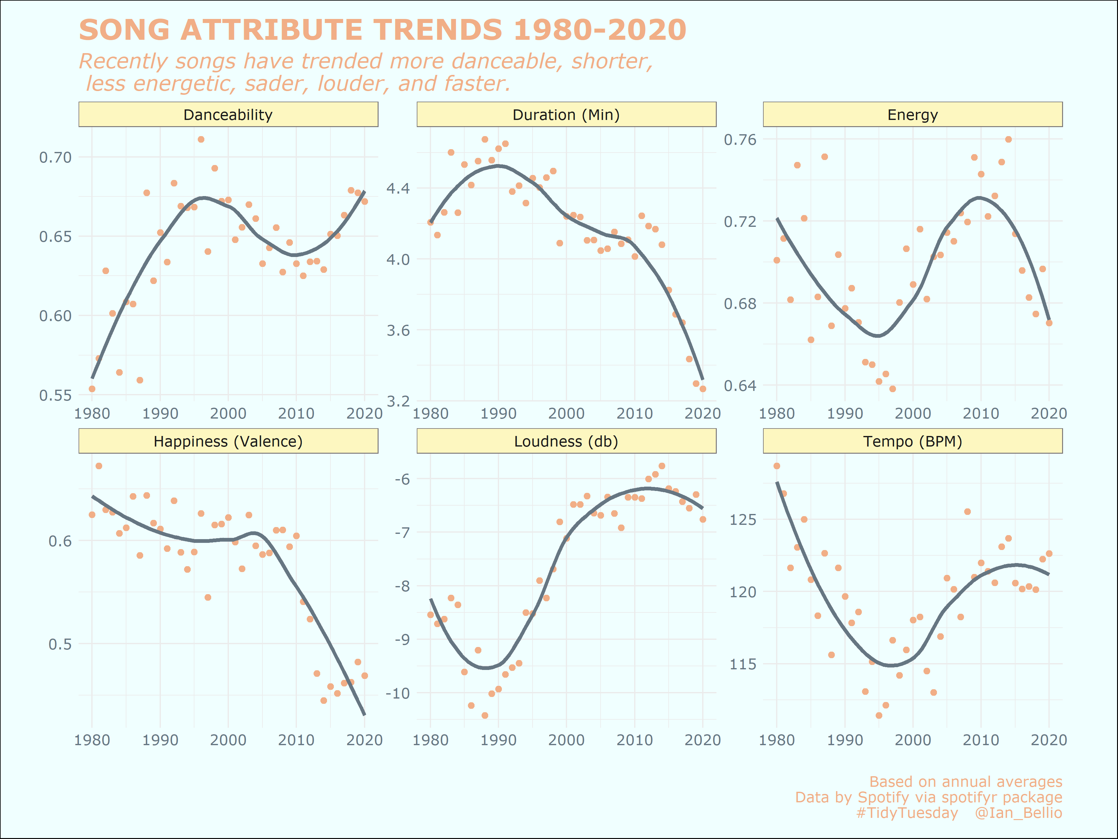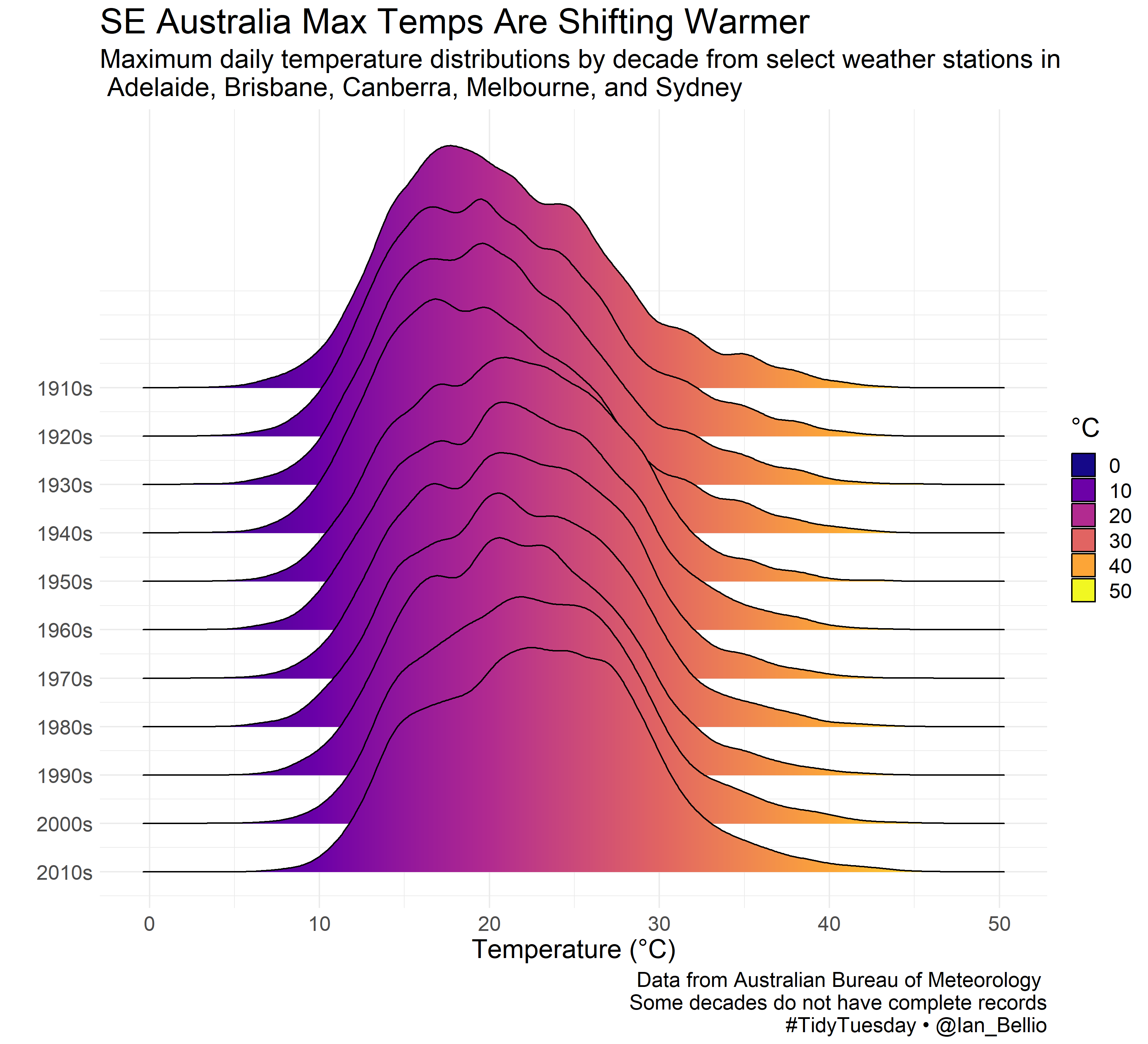 I use the Tidy Tuesdays project as a way of improving my R coding and data analysis skills at lunch or after work. Here are a few of my favorite data visualizations. All my Tidy Tuesday contributions can be found at my Tidy Tuesdays Repo.